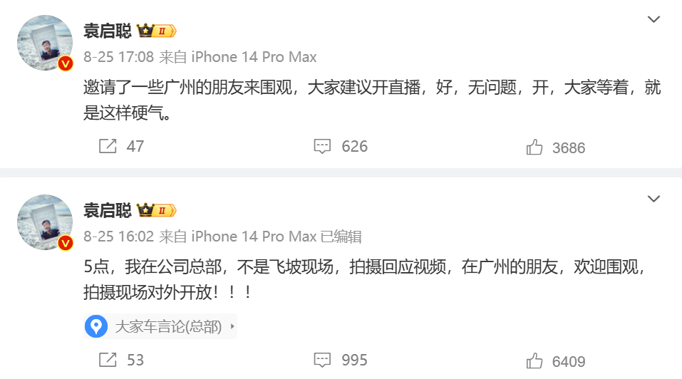 8月25日14:47,袁启聪再次转发享界汽车官方声明表示,“不等了,我现在回公司拍”。