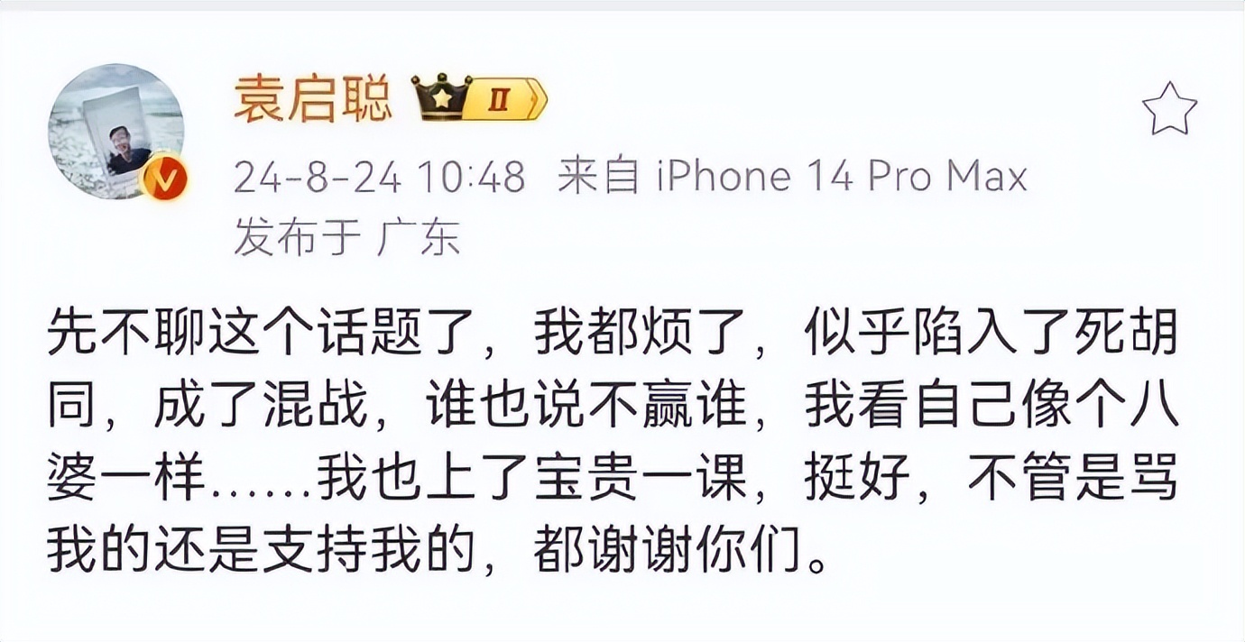 8月25日20:44,袁启聪在哔哩哔哩回应微博被封号禁言。