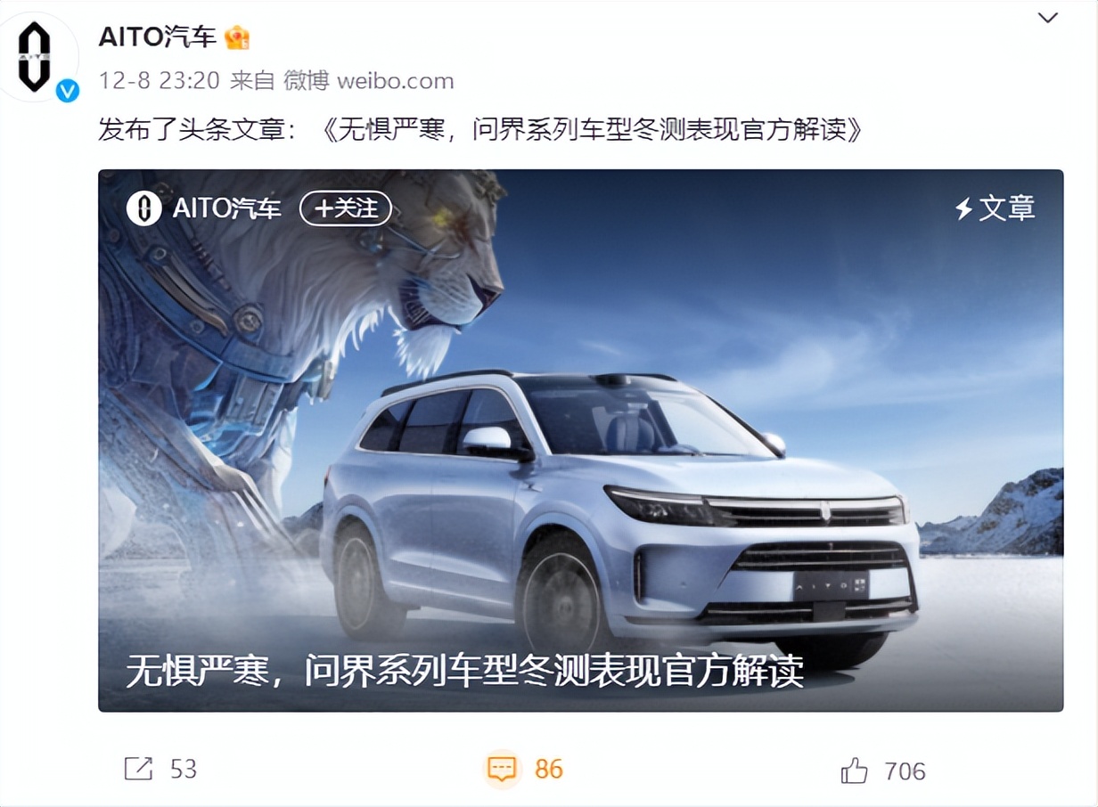 2023年12月6日,汽车平台“懂车帝”在黑龙江漠河进行了2023冬测,公布了19款混合动力车型的续航测试结果。其中,问界M7增程版以31.6%的纯电续航达成率垫底。对此,AITO汽车发布《无惧严寒,问界系列车型冬测表现官方解读》指出,经测试媒体确认,车辆在正式测试前进行了长时间的空调制热,且此过程中有十余次开关车门、车窗的操作,大大增加了空调能耗,导致电量快速下降。在严寒极限及空调持续制热条件下,多次长时间开车窗、车门,严重背离用户真实使用场景。“懂车帝”在直播中回应,所有车型都执行统一标准,不存在针对具体某款车的情况,不影响最终排名。