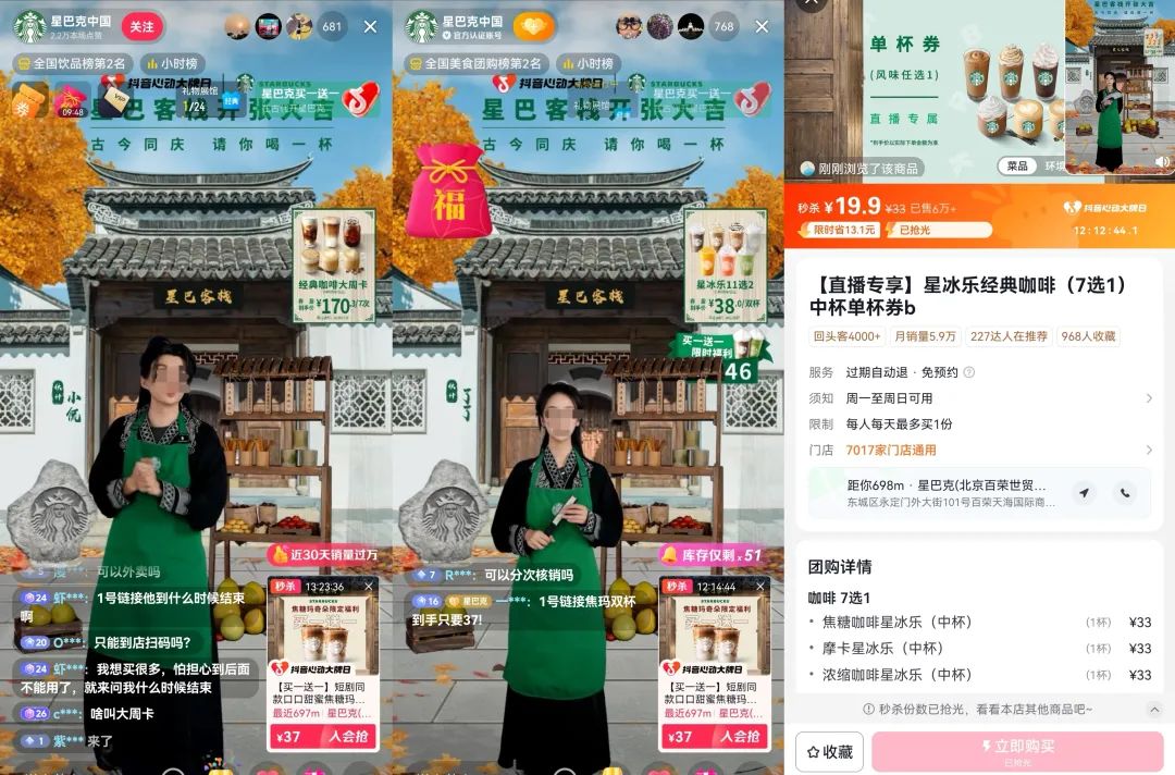 剧里主角提到的“39.9文两杯”、“第二杯星巴客栈请”等优惠活动,正和星巴克中国直播间所主打的优惠一致;官方直播间的装扮也呼应了剧内风格,以星巴客栈为背景,主播穿上剧中主角同款服饰,售卖短剧同款饮品,比如火晶柿子星冰乐、柚子铁观音茶拿铁、板栗红豆沙,秒杀价19.9,焦糖玛奇朵(燕麦/焦糖/金烘焦糖)37块钱买一送一,直播间里所售卖的产品折扣低至4.9折。
