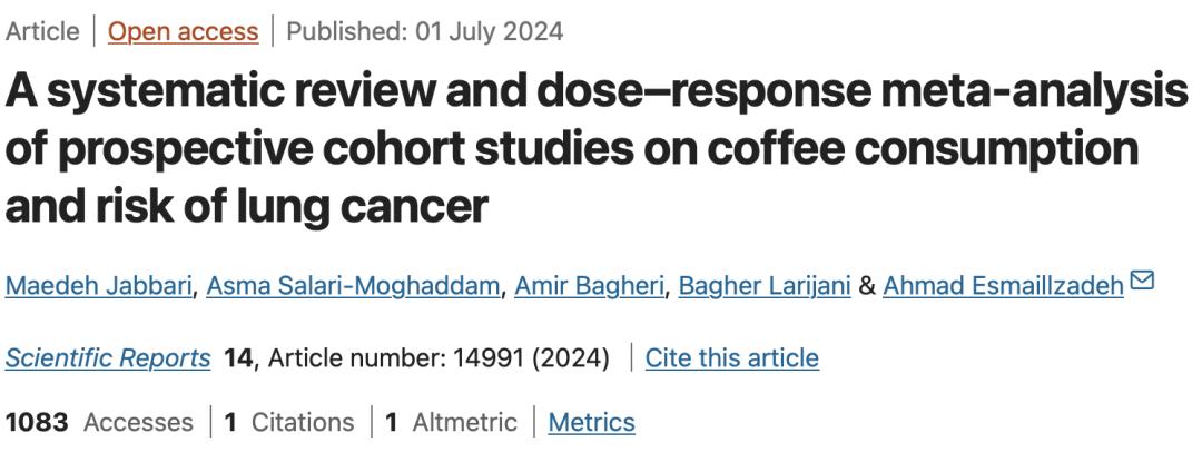 [1]Jabbari, M., Salari-Moghaddam, A., Bagheri, A. et al. A systematic review and dose–response meta-analysis of prospective cohort studies on coffee consumption and risk of lung cancer. Sci Rep 14, 14991 (2024). https://doi.org/10.1038/s41598-024-62619-6