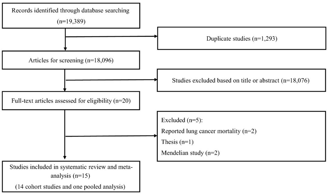 截至2023年7月,经过初步检索,找到19,389篇文章。筛选之后,最终汇总14项前瞻性队列研究,随访时间在10-17.7年不等。