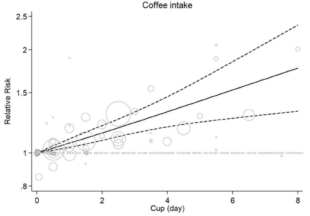 咖啡消费量与肺癌风险之间的关系剂量反应分析更能说明问题。无论是纳入8项还是11项,研究结果均显示,随着每日饮用咖啡量的增加(每天大约1-5杯),肺癌的患病风险也线性增加;每天每多喝1杯咖啡,罹患肺癌的风险将增加6%。