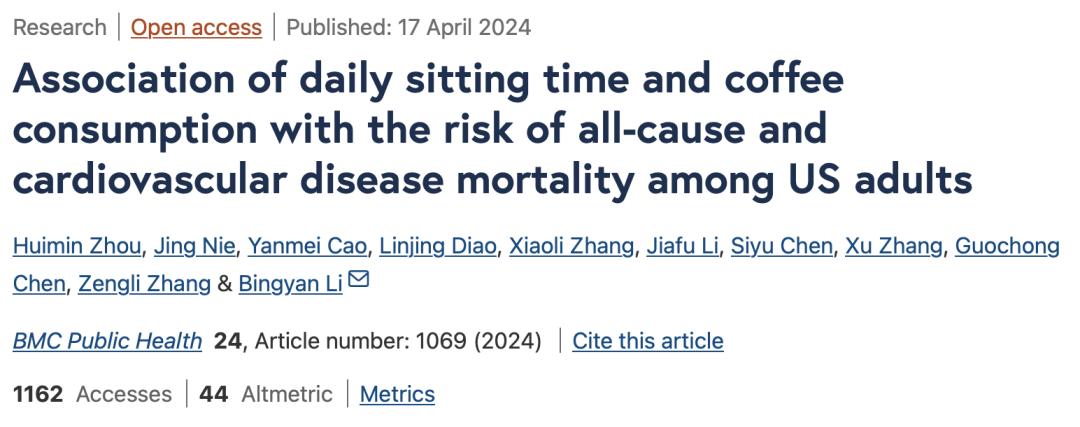 [2]Zhou H, Nie J, Cao Y, Diao L, Zhang X, Li J, Chen S, Zhang X, Chen G, Zhang Z, Li B. Association of daily sitting time and coffee consumption with the risk of all-cause and cardiovascular disease mortality among US adults. BMC Public Health. 2024 Apr 17;24(1):1069. doi: 10.1186/s12889-024-18515-9. PMID: 38632571; PMCID: PMC11022421.