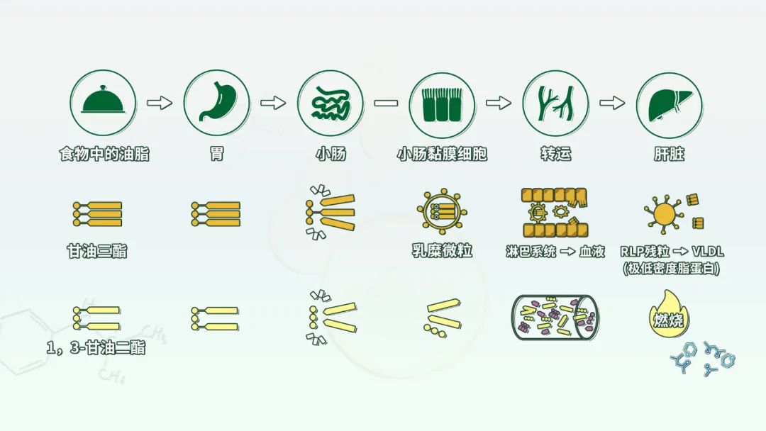 天然油脂中蕴藏着一种珍稀的微量成分——「甘油二酯」,它在人体内的代谢过程与常见的甘油三酯截然不同。甘油三酯进入人体后,在小肠内被酶解为2-单甘酯和游离脂肪酸,并在小肠上皮细胞中重新合成为甘油三酯,易导致体内脂肪蓄积。而甘油二酯由于分子结构中仅连接了两个脂肪酸分子,在人体消化吸收过程中,无法合成甘油三酯,从而减少了脂肪在体内的堆积。同时,由于它可以作为直接能量来源被利用,在一定程度上能够有效促进体脂及内脏脂肪的减少。