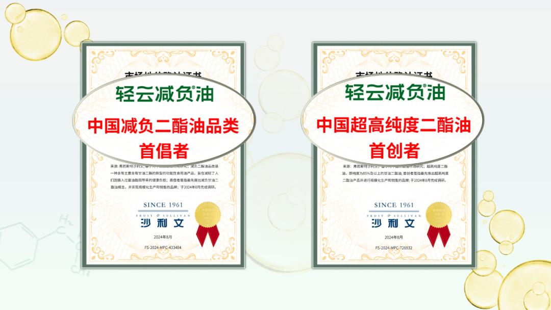 近年来,轻云更是凭借卓越的产品品质和科技创新,连续获得了FBIF创新功能性食品奖、营养健康产业创新产品奖及ISEE全球美味奖等众多国内外权威奖项,同时,还获得了弗若斯特沙利文(Frost & Sullivan)机构的市场地位双重认证,为减负®油的品质与信誉提供了坚实的保障,让消费者买得安心、吃得放心。在追求美味与健康并重的今天,选择一款低负担的食用油至关重要。生活要减负,身体更需减负。让我们从现在开始,一同进入全民用油减负时代。