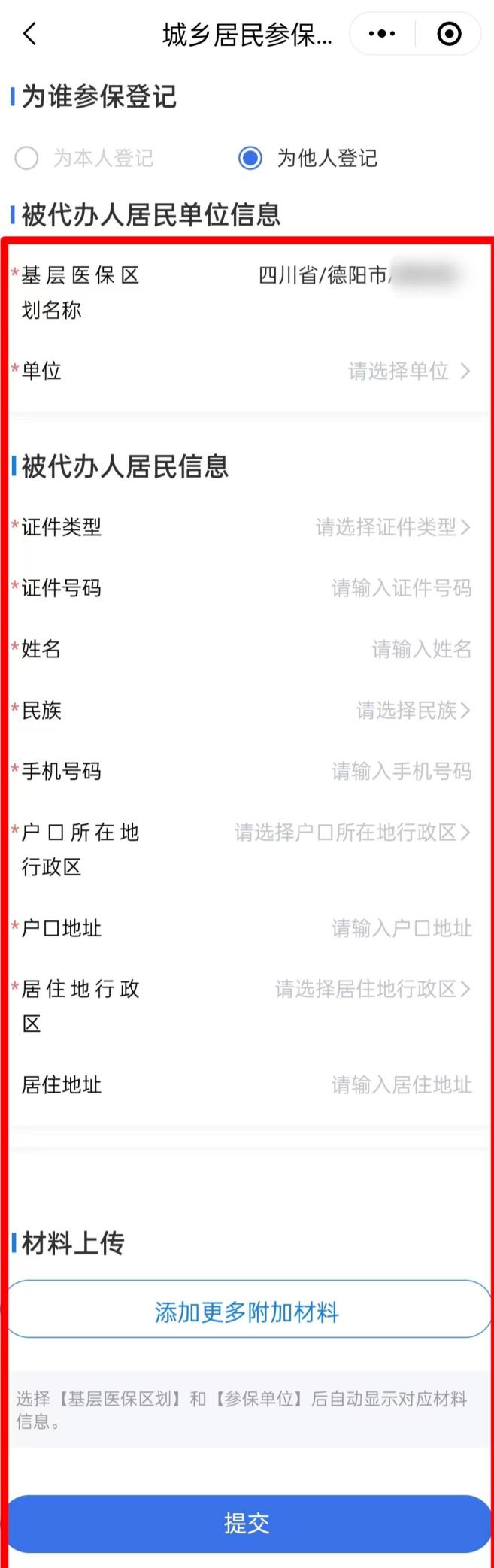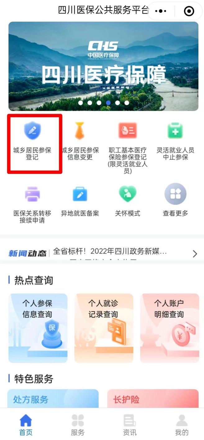 登录四川医保公共服务平台→城乡居民参保登记→选择“为本人登记”或“为他人登记”→选择基层医保区划名称(区、市、县)→选择参保单位→按要求填写参保人信息→按要求上传所需资料→提交。