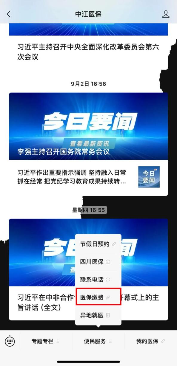超详细!城乡居民医保缴费手机操作,手把手教你3.关注“中江医保”微信公众号,在微信菜单中依次点击“便民服务—医保缴费—缴费—选择“四川电子税务局”或者任一银行,填写缴费人信息,核对后进行缴费。