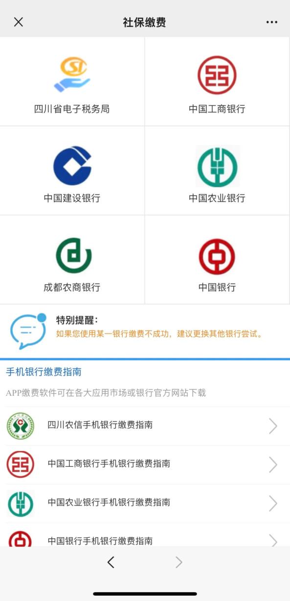 2.关注“四川税务”微信公众号,在微信菜单中依次点击“办税缴费—社保缴费—缴费—选择“四川电子税务局”或者任一银行,填写缴费人信息,核对后进行缴费。