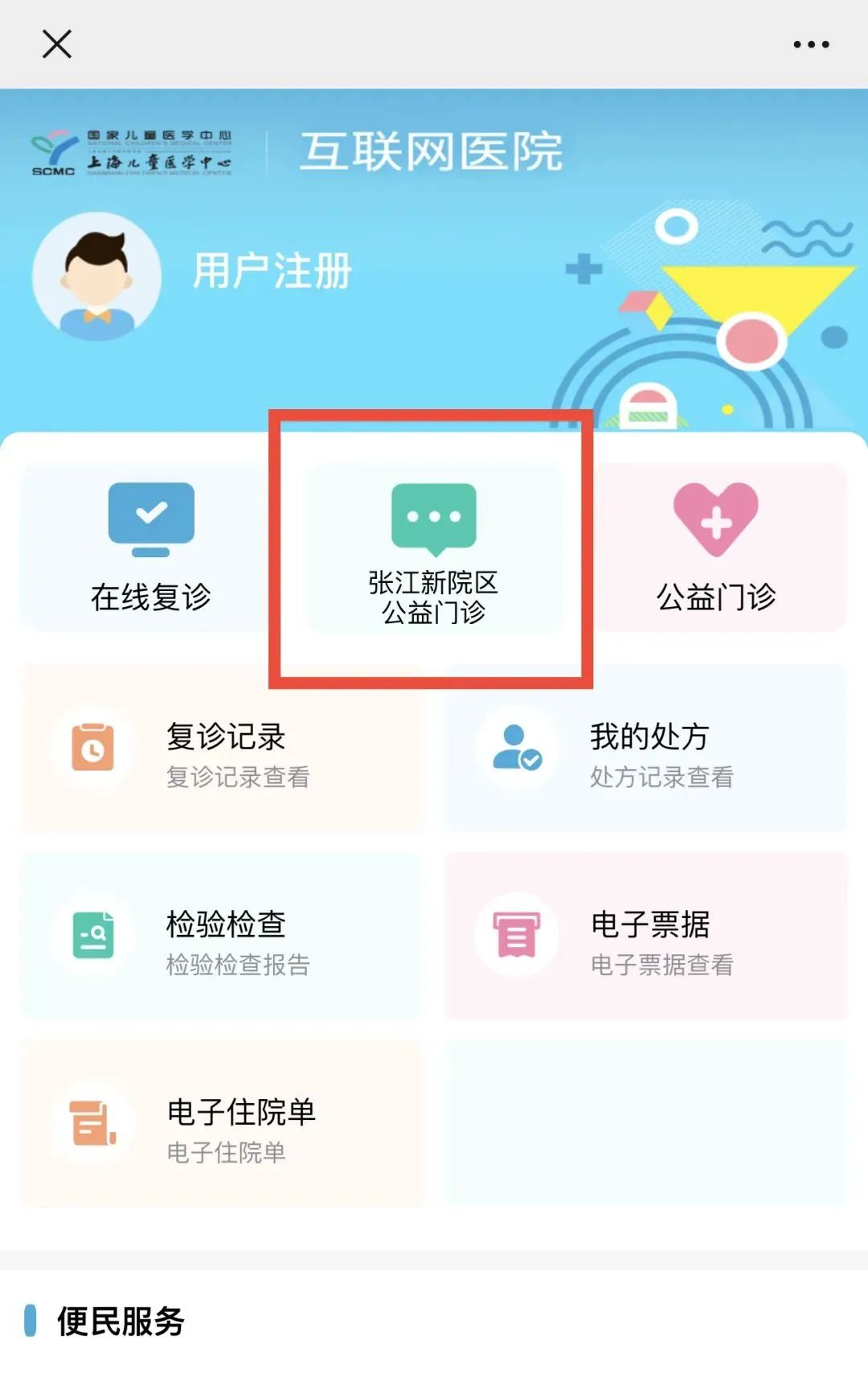 1. 请微信扫描下方二维码,关注【上海儿童医学中心患者服务】公众号;2. 首页点击【互联网医院】→点击【张江新院区公益门诊】→ 选择相应的【科目】进行预约挂号;