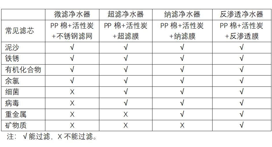 净水器按照不同滤芯组合一般分为微滤净水器、超滤净水器、纳滤净水器和反渗透净水器。