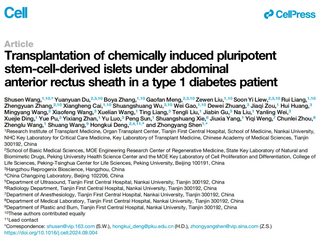 2024年9月25日,南开大学/天津市第一中心医院沈中阳、王树森团队、北京大学/昌平实验室邓宏魁团队与杭州瑞普晨创科技有限公司的研究人员合作,在国际顶尖学术期刊 Cell 上发表了题为:Transplantation of chemically induced pluripotent stem-cell-derived islet under the abdominal anterior rectus sheath in a type 1 diabetes patient 的研究论文【3】。
