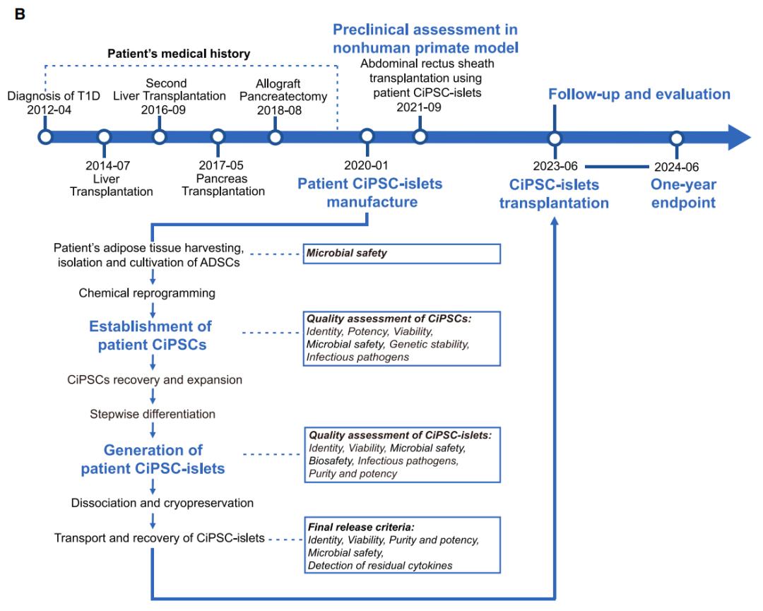 这名25岁的女性在2012年被诊断患有1型糖尿病(T1D),她曾因隐源性肝硬化分别在2014年和2016年进行了肝移植,在2017年因血糖控制不稳定进行了1次全胰腺移植,但一年后因为严重血栓性并发症,胰腺移植物被切除。此外,为了维持肝移植,她需要定期接受免疫抑制治疗。2023年6月,她接受了CiPSC-胰岛移植。