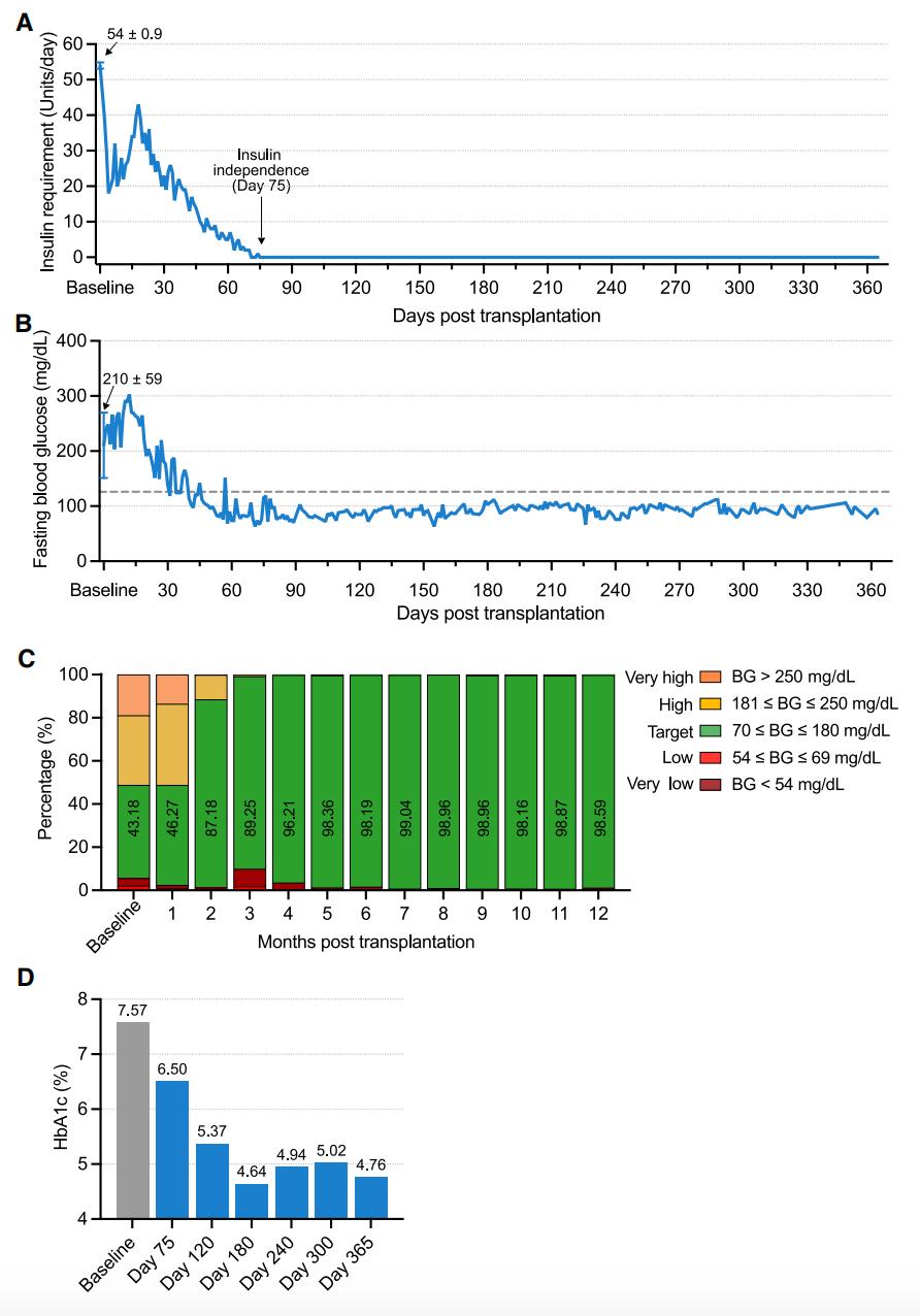 研究团队对该患者进行了1年时间的跟踪随访,患者在移植后第75天开始不再需要胰岛素治疗,在移植后第4个月时,目标血糖范围的达标时间从基线值的43.18%提高到了96.21%,同时,糖化血红蛋白(HbA1c)指标也出现了下降,达到了非糖尿病患者的长期系统性血糖水平。从那以后,患者的血糖控制状态稳定,血糖达标时间超过98%,糖化血红蛋白水平约为5%。在这一年的临床数据中,所有研究终点均已达到,没有出现与移植相关的异常情况的迹象。