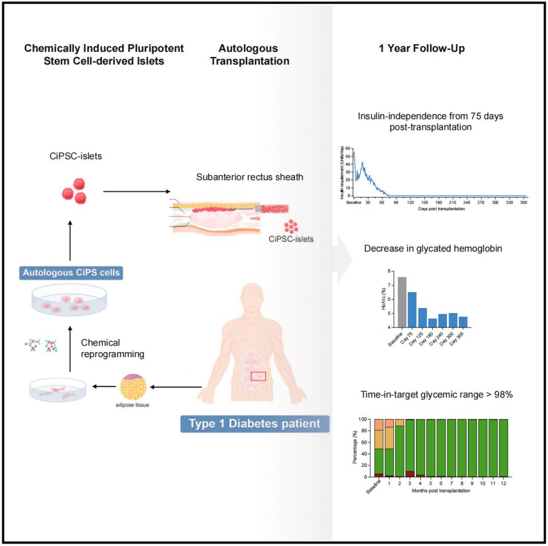 研究团队将化学重编程多能干细胞分化而来的胰岛(CiPSC-islets)移植到了一名1型糖尿病(T1D)患者的腹直肌前鞘下,获得了可耐受的安全性,并且在1年随访中不再需要外源胰岛素治疗,且恢复了血糖控制。这名患者的治疗效果鼓舞人心,支持了腹直肌前鞘下CiPSC-胰岛移植治疗1型糖尿病(T1D)的可行性。