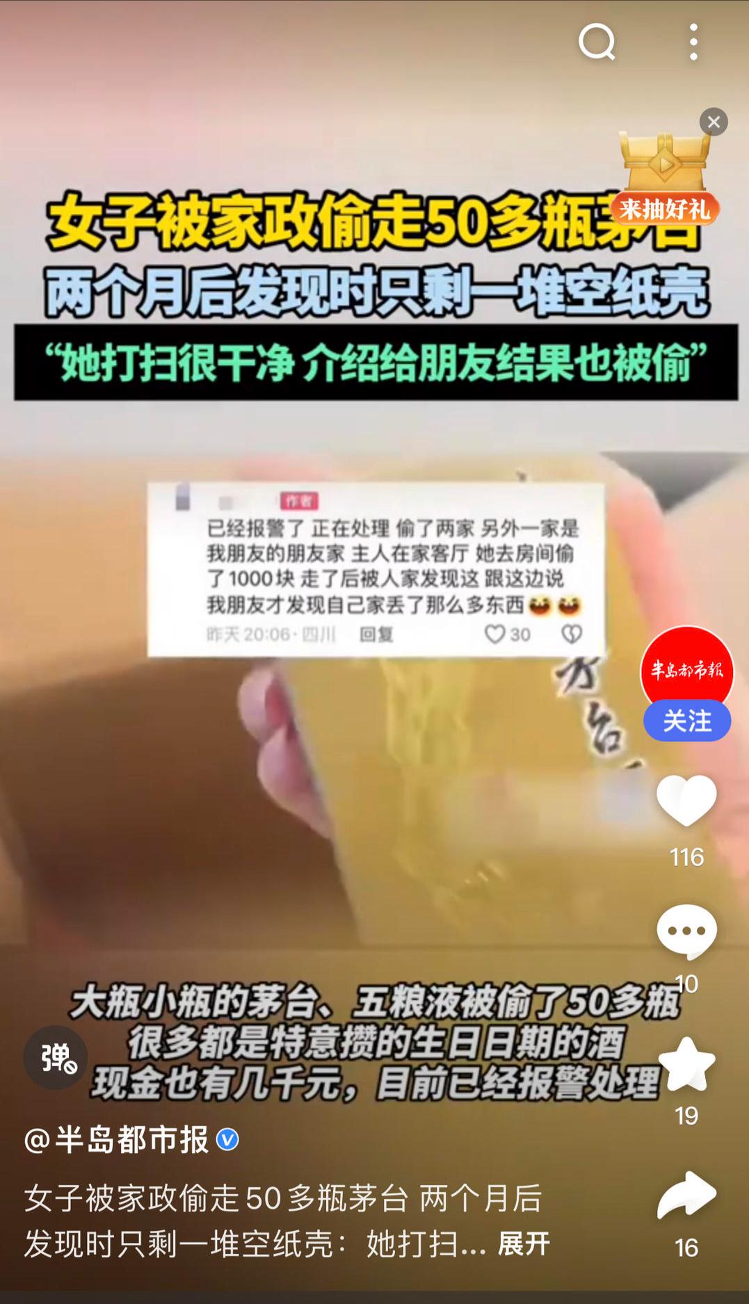 女子被家政偷走50瓶茅台,两个多月后才发现?警方:偷了30多瓶,嫌疑人已供认