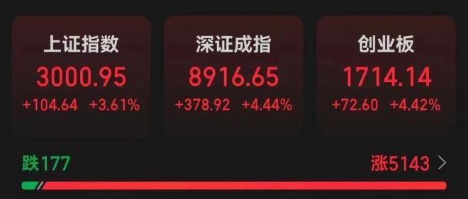 沪指午后涨势如虹,14:56突破3000点大关,收盘涨3.61%,报3000.95点,再次上涨超百点。自9月18日开启本轮上涨以来,沪指涨超10%,已经收复今年以来全部跌幅。