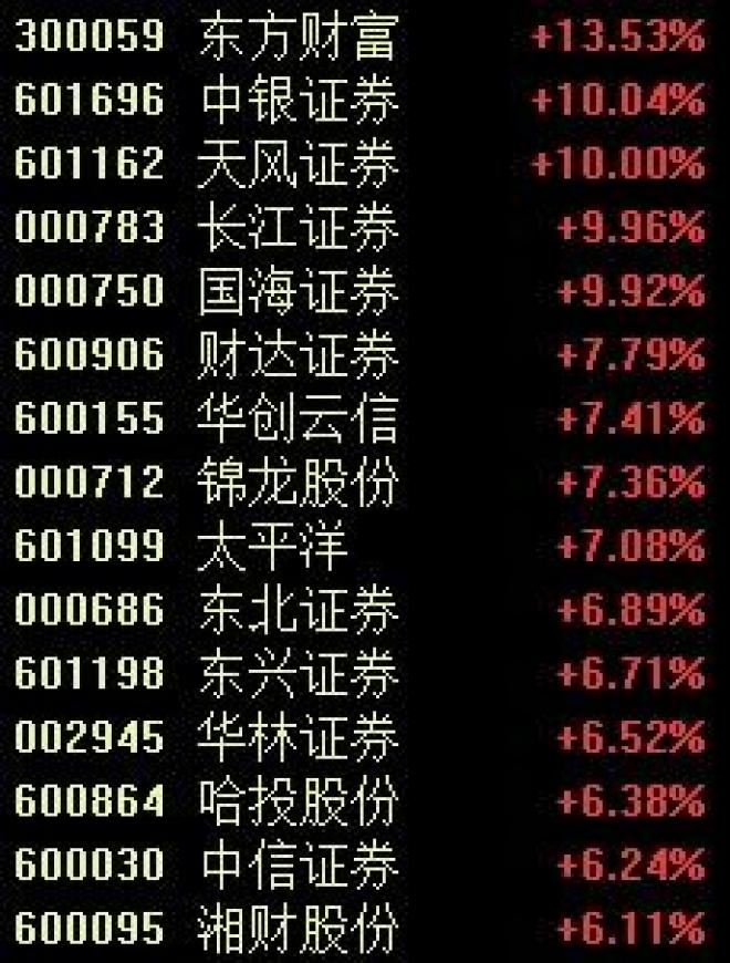 证券板块午后大幅上涨。“券茅”东方财富涨超13%,中银证券、天风证券、长江证券、国海证券等涨停,锦龙股份、财达证券等股跟涨。证券ETF(512880)涨超6%,成交额超30亿元。
