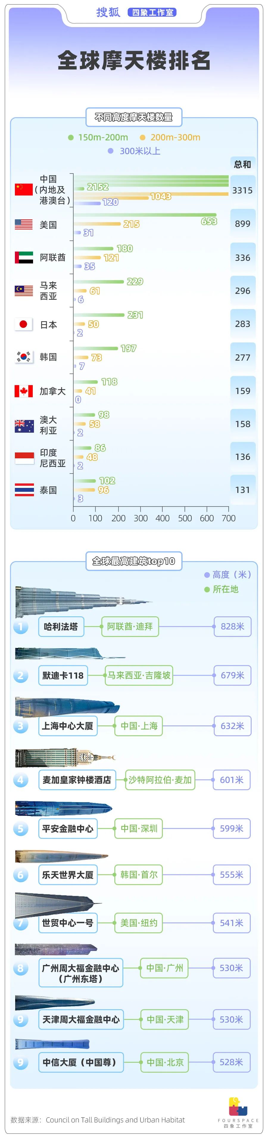 统计数据显示,目前全球摩天楼数量排名前10的国家中7个都来自亚洲,其中又数中国的摩天楼数量傲视群雄,总数达到了第2名美国的3.6倍。