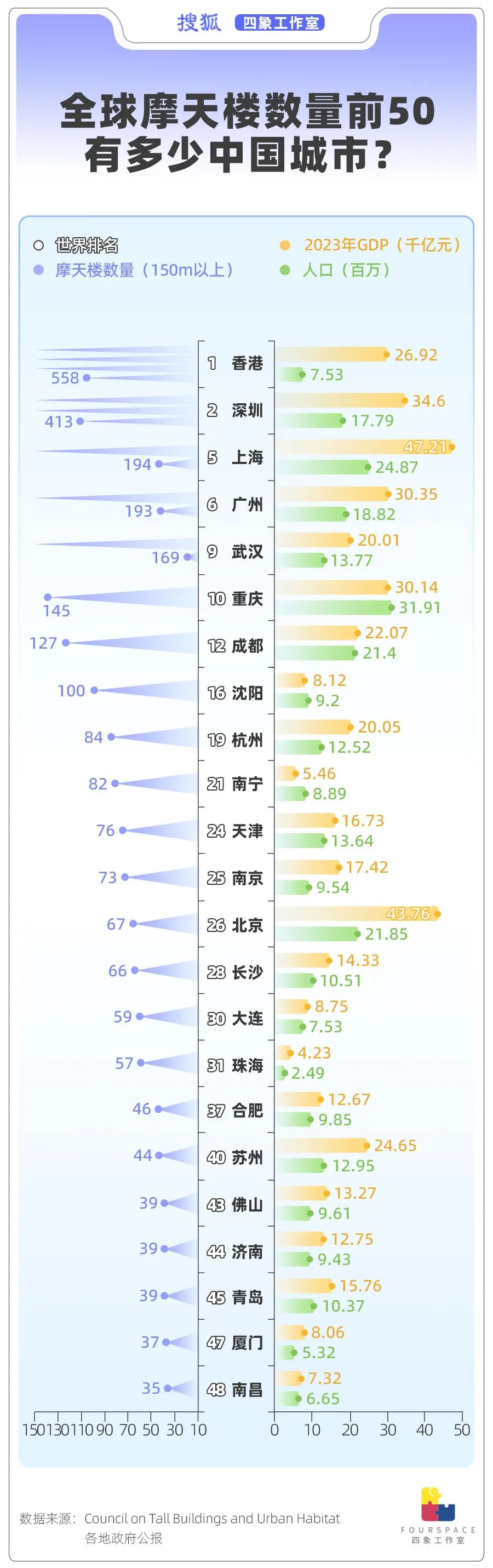 在大众印象里,摩天楼是展现城市经济发展的代表。不过在中国城市的榜单中也可以看到一些“异类”,比如南宁、沈阳不论是人口还是GDP数据都不是最亮眼的那一档,但摩天楼数量排名在全国前十,如果只看300米上的超高摩天楼,南宁甚至能排到全国第七、全球第12的好名次,数量(6座)上和莫斯科、香港并驾齐驱。这也让南宁常常被外界质疑“不务正业”。