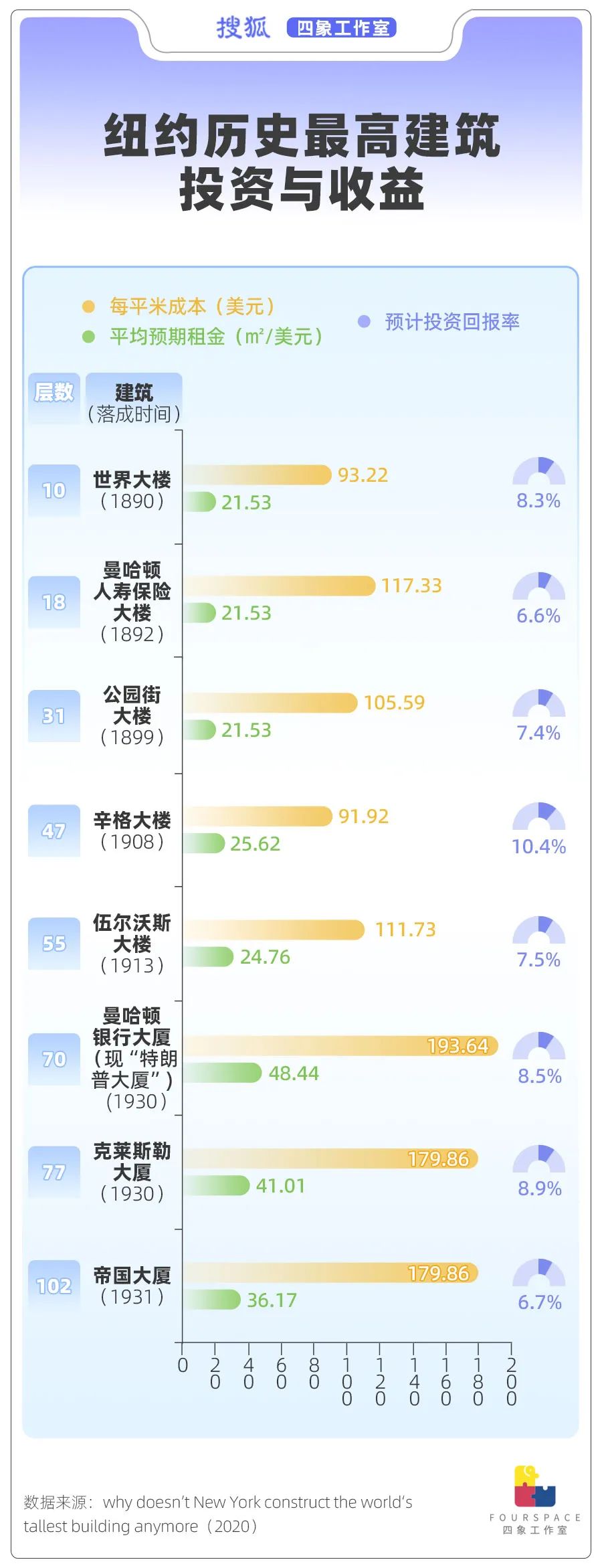 上世纪30年代,美国一些经济学家与建筑师开始研究摩天楼的经济效益,他们发现60多层的高楼油石比70多层的更加赚钱。从历史数据也可以看出,对比纽约各个时期的最高建筑,它们的预期投资回报率并未随着高度的增加而提升。