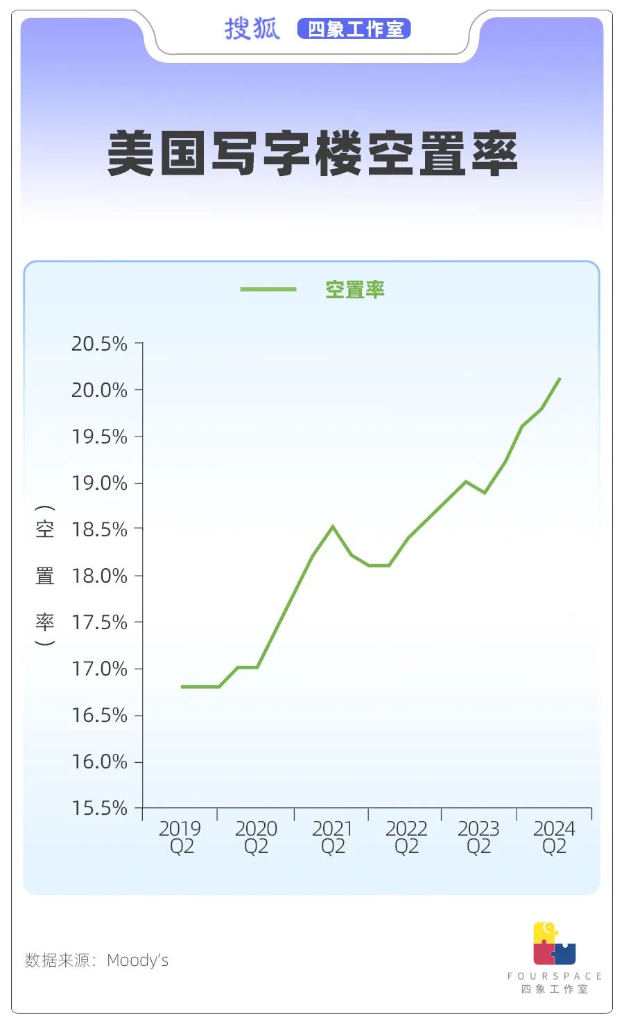 根据债券评级机构穆迪发布的数据,从2019年起美国写字楼的空置率就不断攀升,在刚刚过去的2024年第二季度,空置率已达到20.1%,这是连续第三个季度打破1986年和1991年19.3%的历史峰值记录,同时也是美国历史上这项统计数据首次突破20%。