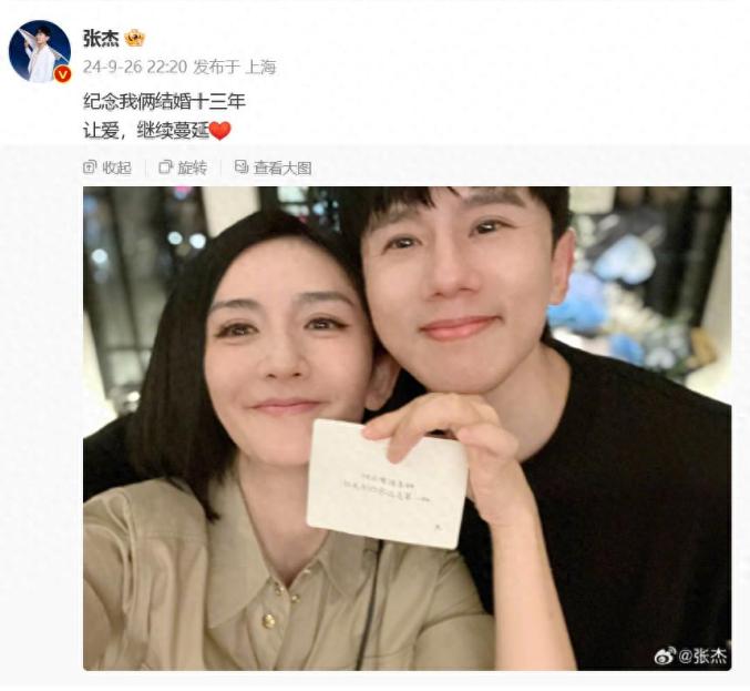 张杰晒出贴脸合照写道:“纪念我俩结婚十三年,让爱,继续蔓延。”