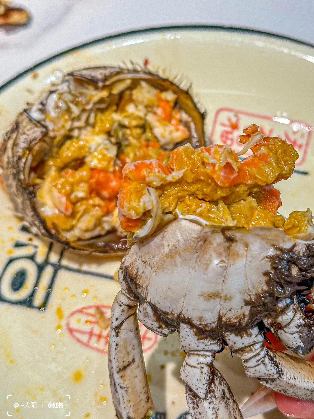 卤出来的河蟹,像是冰激凌一样。蟹子黑亮,蟹膏黄艳,口感绵软且冰爽,一口真的很惊艳,疯狂吃不停。