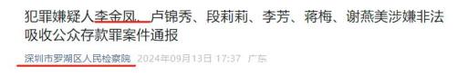 9月13日,深圳市罗湖区人民检察院发布案件通报,艾美系创始人李金凤及5位公司高管,因涉嫌非法吸收公众存款罪,被公安局移送审查起诉。