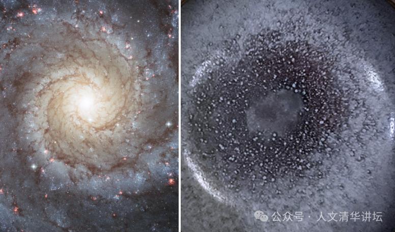当你们看到这样的星空,然后又看到右边的图,大家能否想象右边那张图是钧窑烧成的陶瓷?它们图像的吻合似乎是神秘力量建立起仰望星空与俯身造器的联系,这种联系是穿越时空的、遥远的、需要我们用漫长无限想象力的浪漫去填补,而这个填补就是人类文明史里一切伟大创造的最原始的积淀,那就是“好奇”。