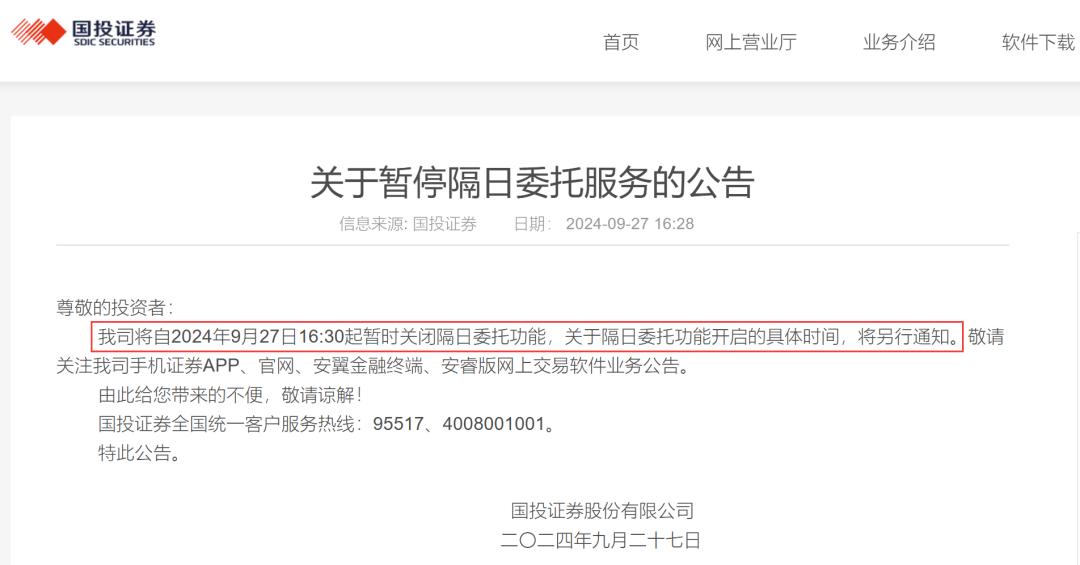 9月27日,国投证券公告称,公司将自2024年9月27日16:30起暂时关闭隔日委托功能,关于隔日委托功能开启的具体时间,将另行通知。