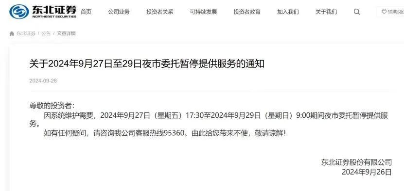 东北证券则在9月26日发布了关于9月27日至29日夜市委托暂停提供服务的通知。