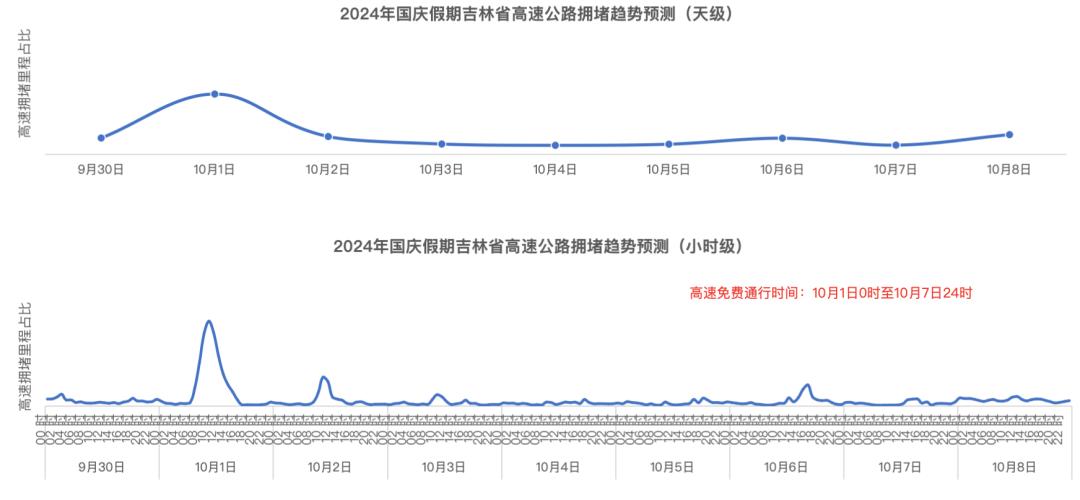 预计吉林省2024年10月1日(假期第一天)上午9时-12时高速出程会有短时拥堵缓行,峰值出现在10时-11时;返程较为平稳,10月6日(假期第六天)16时-17时会有短时缓行,10月8日高速逐渐恢复平日水平。