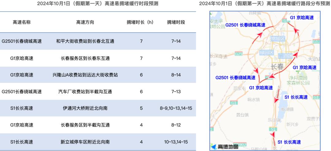 根据高德地图交通大数据预测,节日期间吉林省返程易拥堵缓行的高速主要是G2501长春绕城高速、G1京哈高速等高速的部分路段,根据以往数据分析,长春绕城高速、长长高速长春至伊通段、珲乌高速 484公里(吉林至长春绕城匝道)、511至535公里(长春北至开安段)以及长春绕城高速73公里(半截沟互通匝道)、45公里(长春绕城至吉林匝道)
