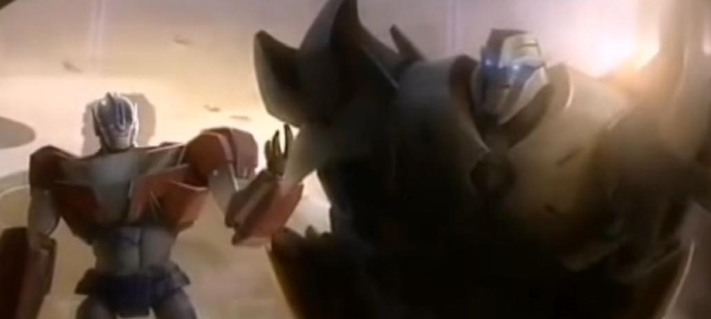 而在动画中,两人在共同抗击宇宙大帝的目标面前再次联合,这次,换威震天将逼近擎天柱的武器,变成了一双拉起宿敌的手。