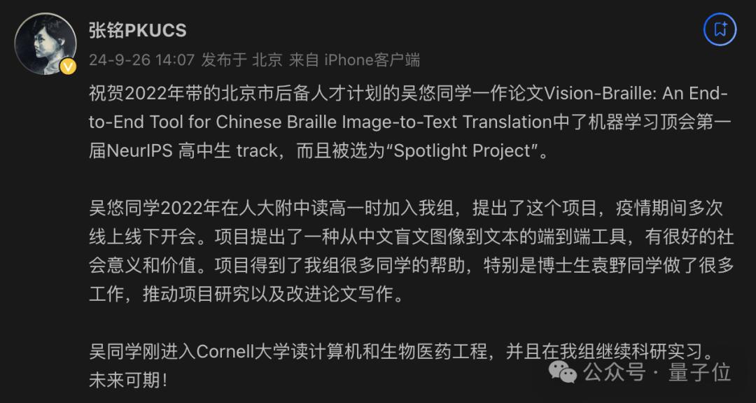 论文致谢中提到,吴悠主要是在张铭教授博士生、论文第二作者袁野的指导下完成了这项研究。