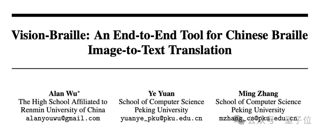论文题为《Vision-Braille:An End-to-End Tool for Chinese Braille Image-to-Text Translation》,提出了一种中文盲文图像到文本的端到端翻译工具。据张铭教授介绍,吴悠在2022年高一加入她的课题组时,就提出了这个项目的想法。