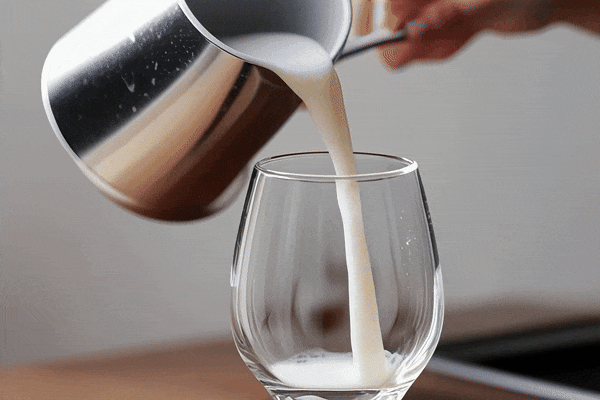 我们输入 Prompt:一只手平稳地将银色水罐中的牛奶倒入透明高脚杯中。
