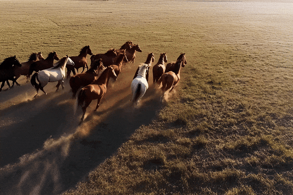 Prompt:航拍镜头,从空中俯瞰到一群活力四射的骏马在一片辽阔的大地上飞驰而过,鬃毛和马尾随风飘扬。