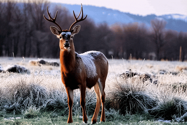 (Prompt:寒冷的冬天,一只鹿站在结霜的田野里,远处有蓝天、枯树和山脉,四周很宁静,鹿的皮毛上沾满了雪,它竖起了耳朵警觉地凝视前方,接着转身向田野远方走去。)动画风格:拥有超强艺术审美