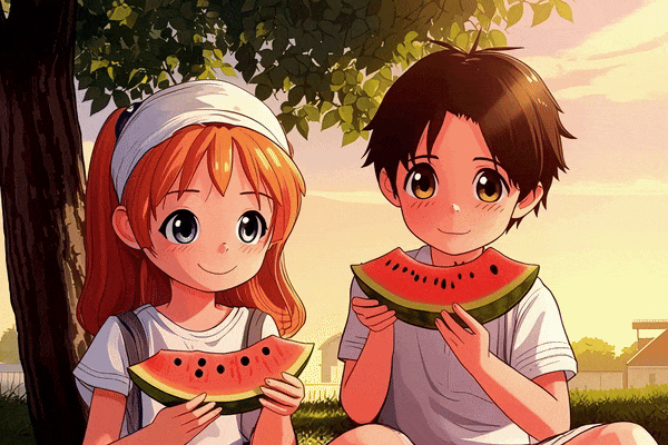 例如,我们输入提示词:动画风格,一个小男孩和一个小女孩正坐在树下吃西瓜。