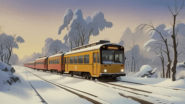 还有火车在白雪皑皑的林海中穿行: