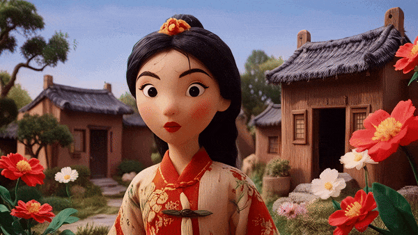 奇想大模型生成的国风动画中,女孩身着中国传统服饰、梳着结鬟式发髻,身后古朴的木屋也有着中国独特的韵味。