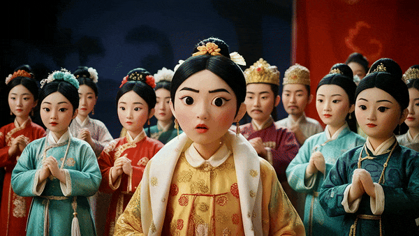 主角表情变化自然,先是表情严肃,微微转动眼珠,继而嘴角挤出一抹神似华妃的「皮笑肉不笑」,肢体动作也很流畅。身后的配角们模样各异,虽无较大动作,但眨巴着眼睛,也相当逼真。
