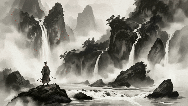 画面中,山间云雾缭绕,瀑布从山崖飞流直下,清流激湍,身穿飘逸长袍的侠客站在岩石上潇洒转身,动作丝毫不僵硬。风格化:追求极致细节