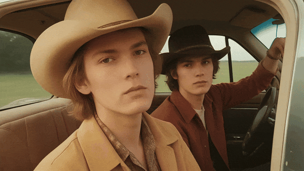 在奇想大模型生成的正面人像视频中,戴着牛仔帽的两个男子坐在车里盯着镜头,身体随着汽车的颠簸而晃动。