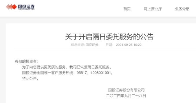 9月28日,国投证券宣布恢复隔日委托服务。