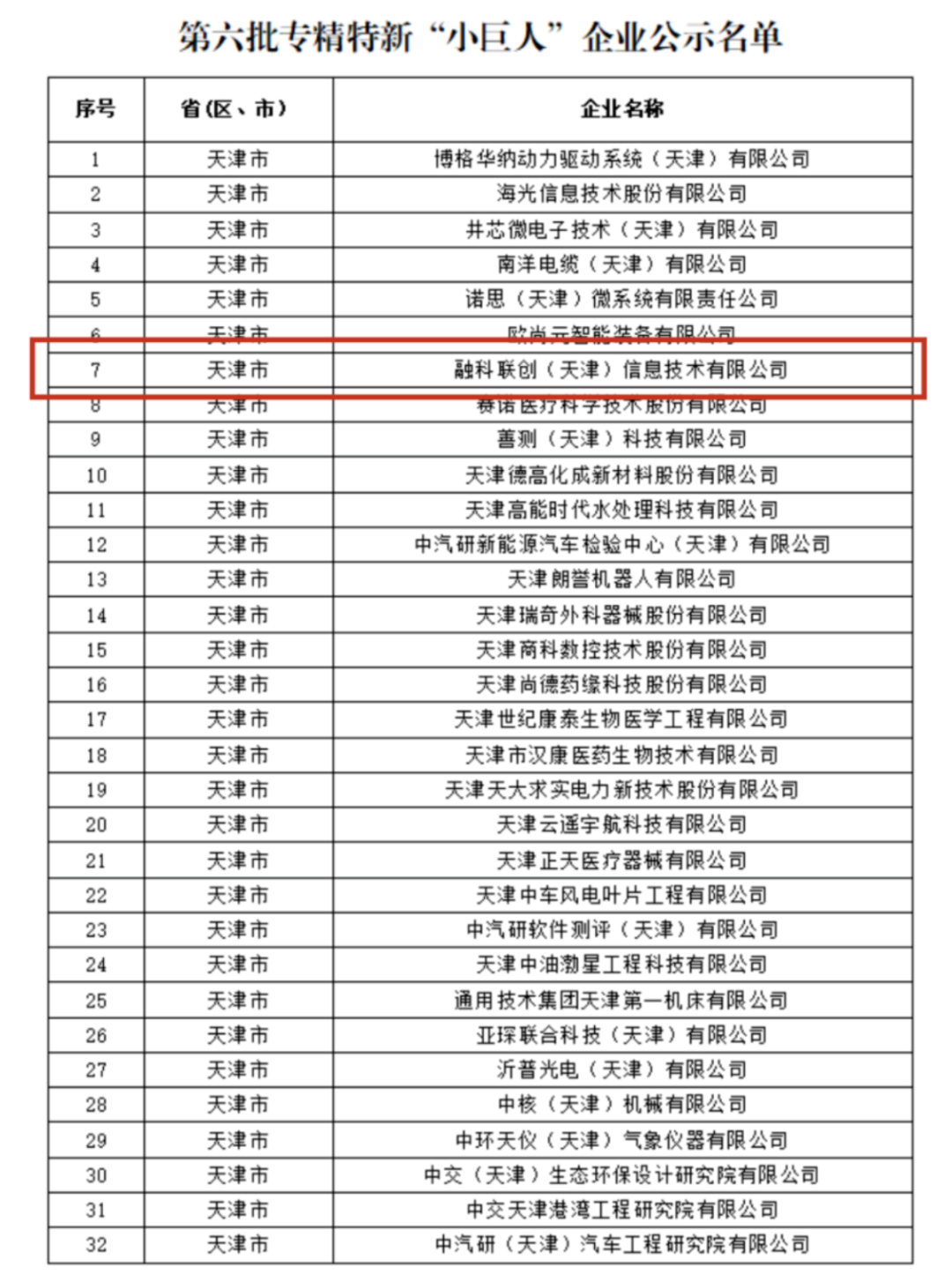 日前,天津市工信局公示了第六批国家级专精特新“小巨人”企业和第三批专精特新“小巨人”复核通过企业名单。位于武清京津产业新城京津科技谷的企业——融科联创(天津)信息技术有限公司(以下简称“融科联创”)被认定为国家级专精特新“小巨人”企业,成为本批次武清区唯一一家获此殊荣的企业。