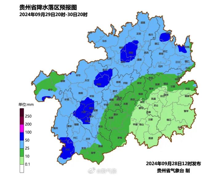 预计,9月28日14时至29日14时,内蒙古中部和东北部、黑龙江西北部、陕西北部和西南部、甘肃东南部、四川东北部、贵州中部、广西西北部、西藏南部等地部分地区有大到暴雨,其中,四川东北部等地局部地区有大暴雨(100~150毫米)。