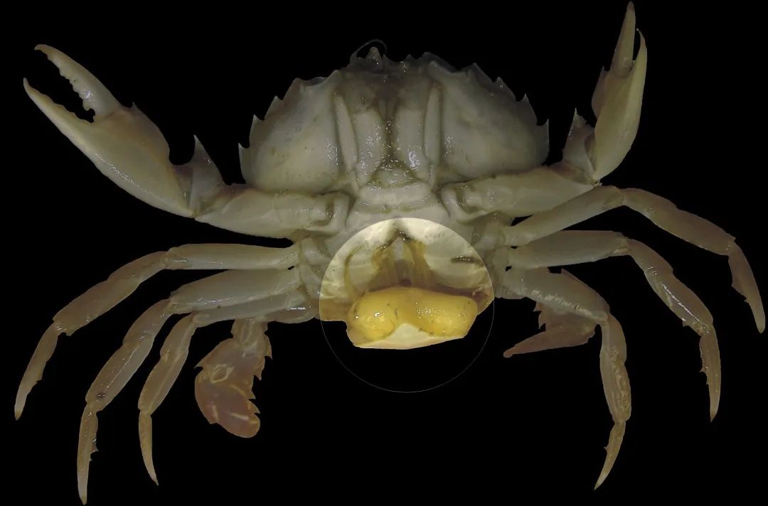 它们在螃蟹体内发育到成年并产卵,卵穿过宿主的皮肤和角质层,在螃蟹的腹部结成一个囊状物。